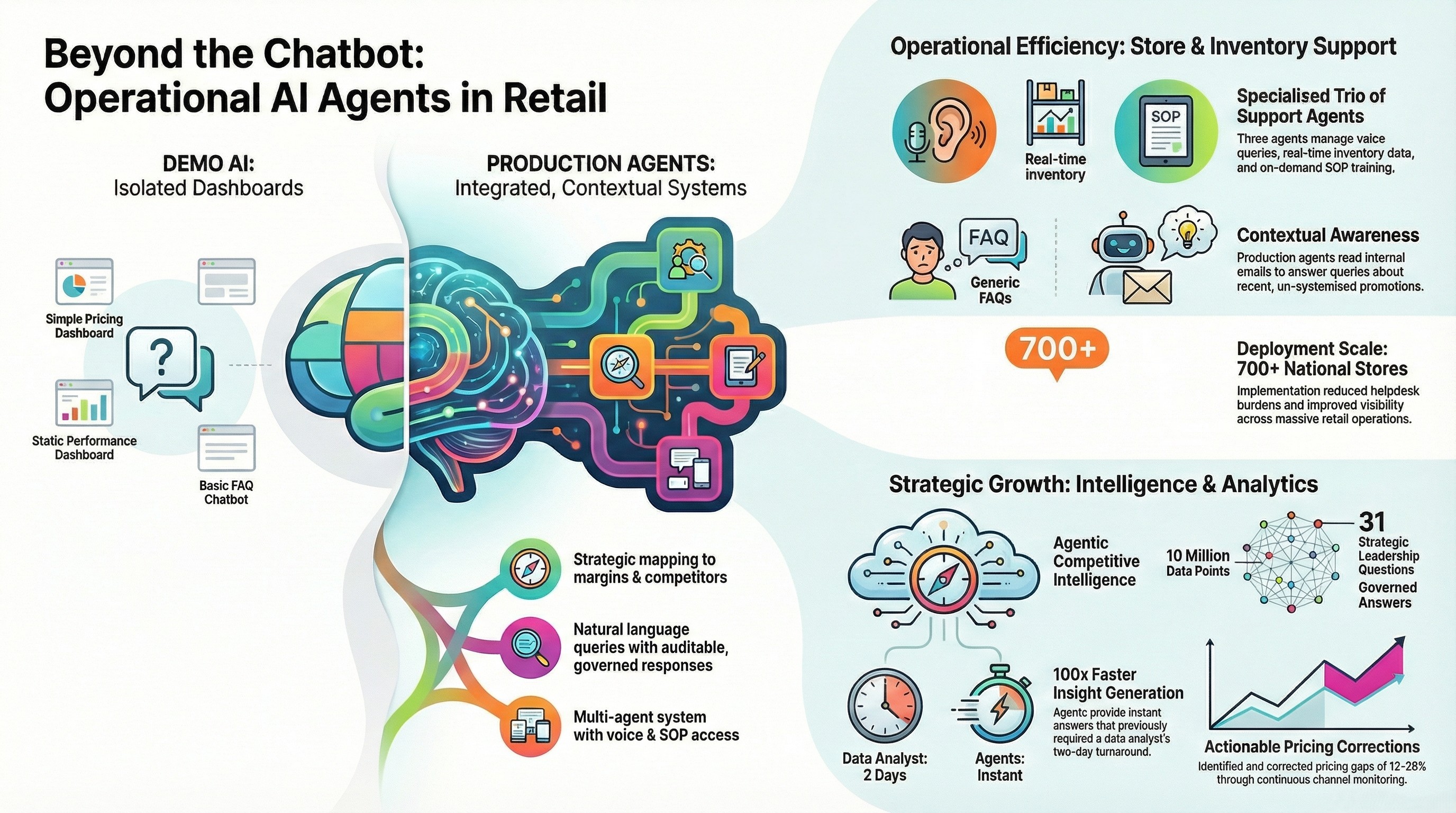The production version: Three specialised agents working in concert. A voice support agent (available in multiple languages) that handles store-level operational queries. An inventory intelligence agent that provides real-time pricing, stock, and promotional information per store. A knowledge and training agent that delivers on-demand guidance from POS documentation and standard operating procedures. All three operate with full context and log every interaction for operational analytics.