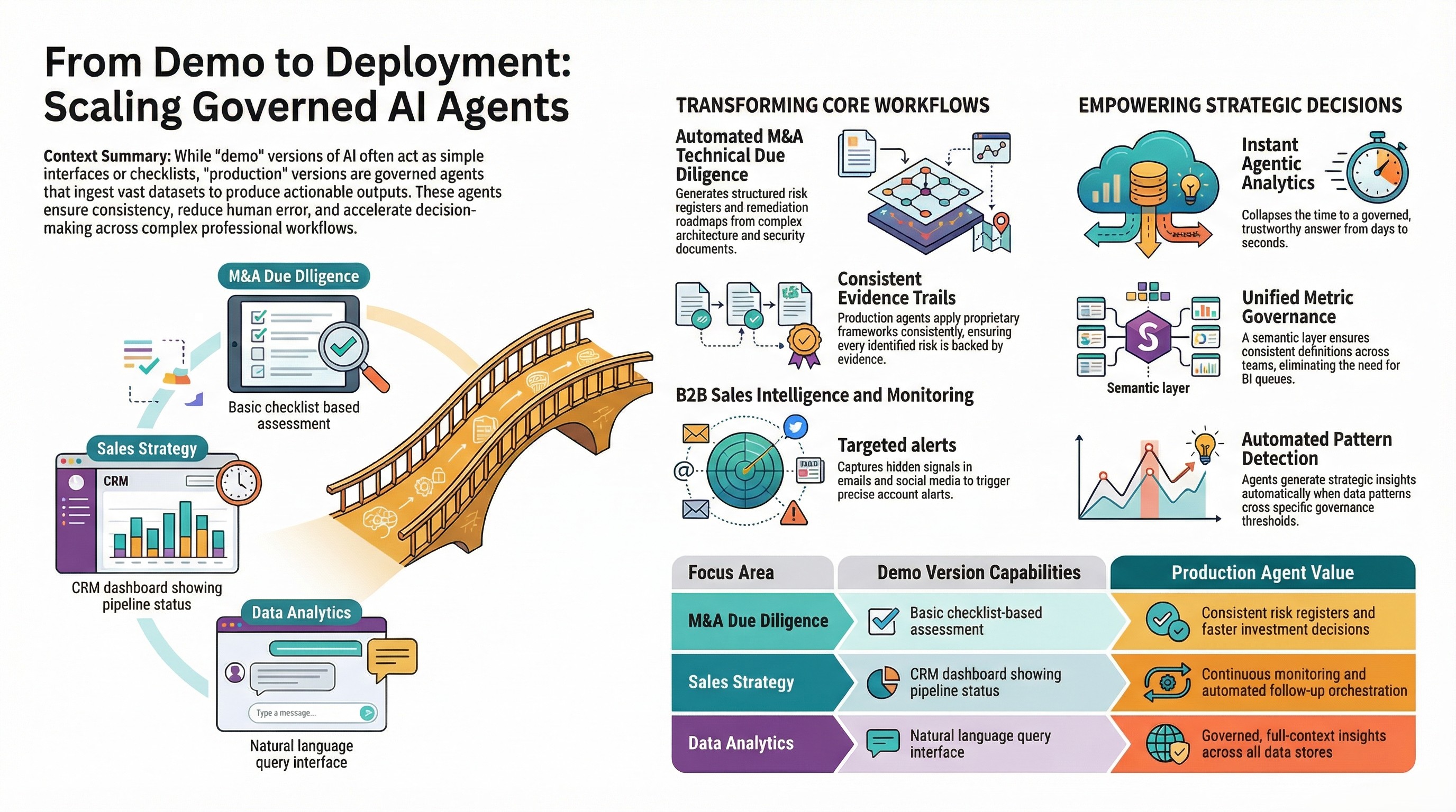 The production version: A due diligence agent that ingests target company documentation — architecture specifications, security audit reports, prior incident records, engineering assessments — and produces structured risk registers with remediation roadmaps. The Semantic Governor applies the firm's proprietary evaluation framework consistently, producing comparable outputs across every assessment regardless of which analyst runs the process.