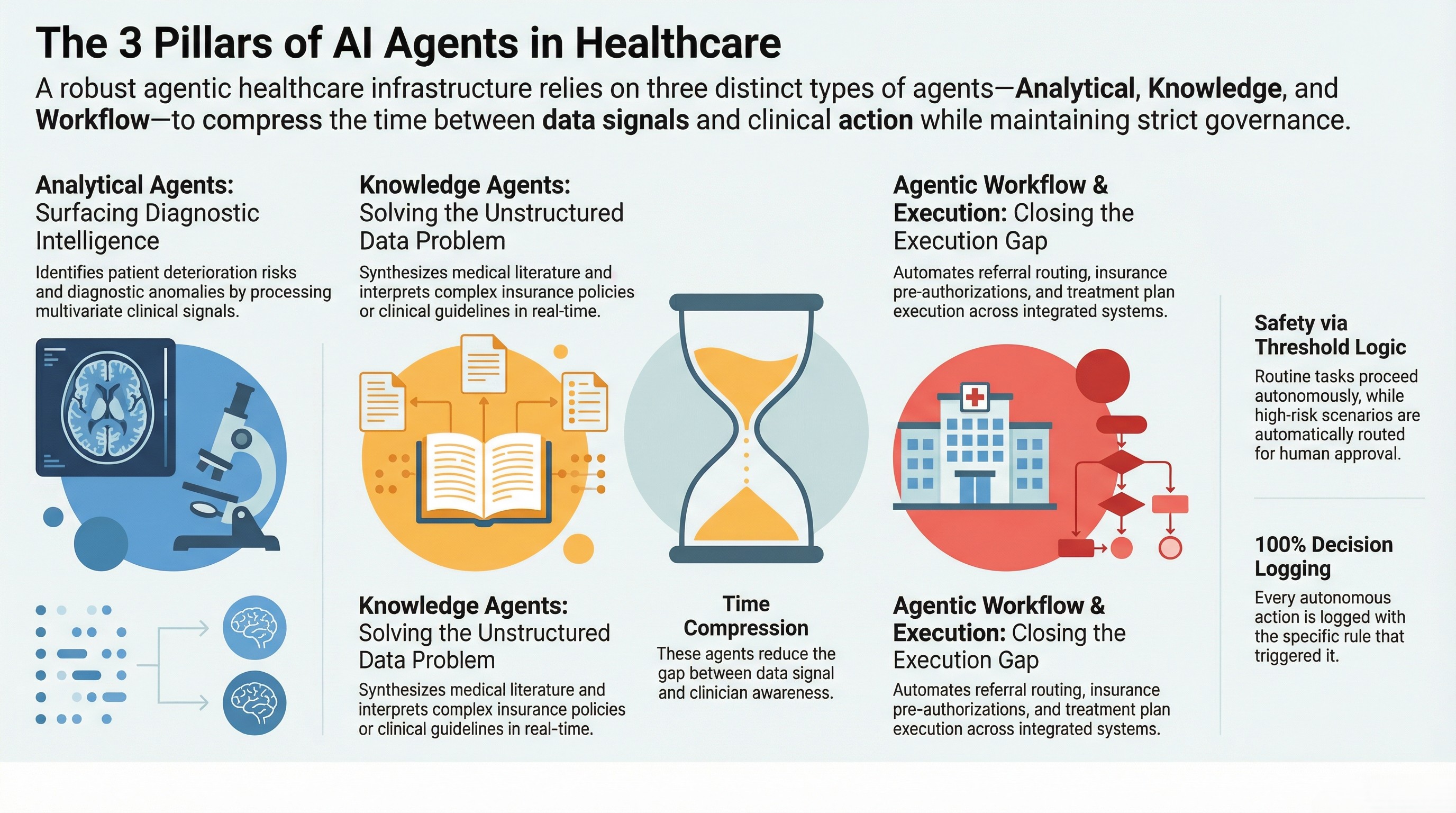 Safety in agentic AI depends entirely on the governance architecture. A system with a unified context engine that prevents decisions on partial data, a semantic governance layer that encodes clinical rules and escalation policies, and complete audit trails with policy-cited decision logs can be deployed safely in clinical settings. A system without these layers — acting on incomplete data with no deterministic governance — is not safe, regardless of its diagnostic accuracy on benchmarks.