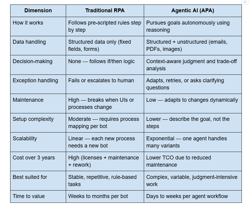 The difference isn't incremental — it's structural. APA handles the 80% of work that RPA was never designed to touch: the exceptions, the variations, the judgment calls.