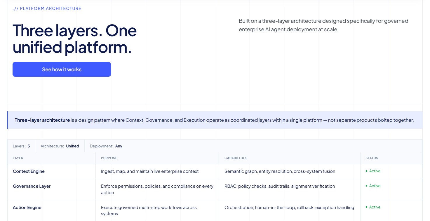 Governance-grade agentic AI. If your industry requires documented, auditable AI decision-making — financial services, healthcare, utilities, legal — the governance architecture is a procurement requirement, not a preference.