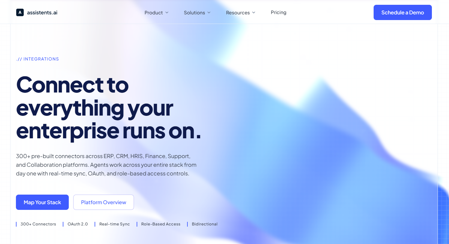 assistents.ai connects to 300+ enterprise systems with both read and write capability. This includes ERP systems like SAP (with demonstrated SAP Sales Order creation via agentic automation), CRM platforms like Salesforce, ITSM systems like ServiceNow, Oracle, and operational systems across logistics, HR, finance, and customer service. The platform has deployed real agentic automation to interpret order triggers, validate, and create SAP Sales Orders — replacing end-of-life legacy systems like OpenText ECR — with rules-based governance for exceptions and approvals, and full audit logs and reconciliation reporting.