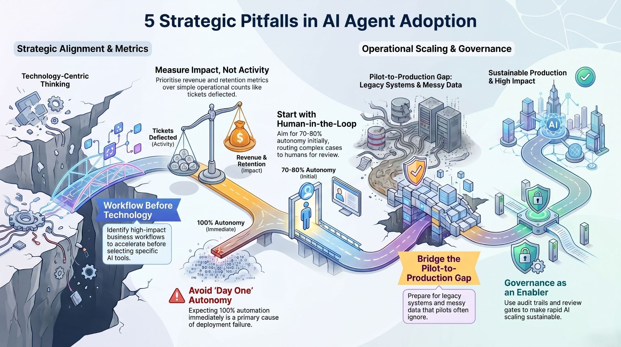 A pilot that succeeds in a controlled environment with clean data and an isolated workflow is not evidence that the same agent will succeed in production at scale. Production means legacy systems, messy data, edge cases, and compliance requirements. Bridge that gap before declaring success.