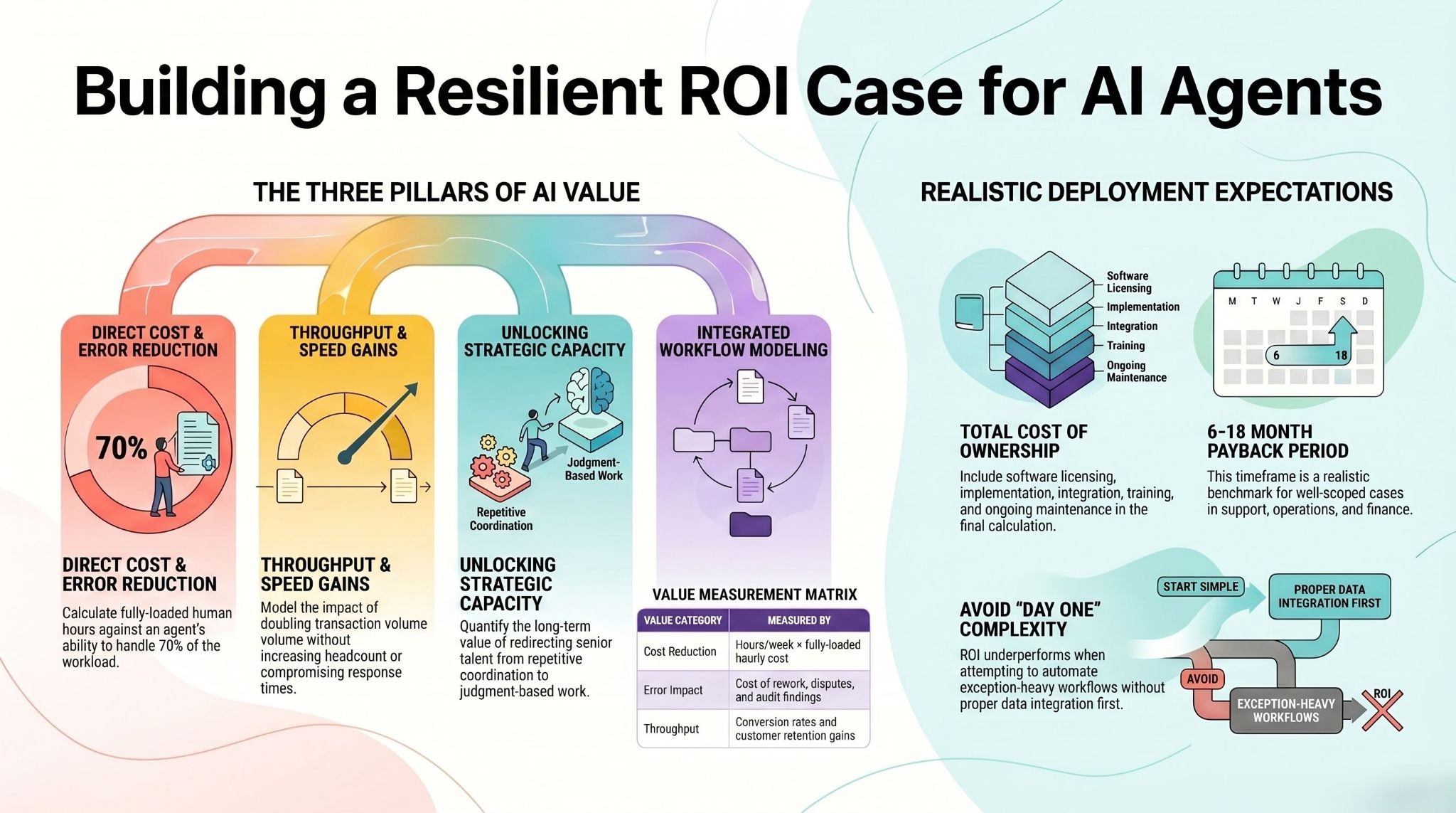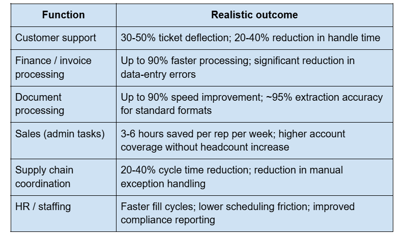 Important note: these are realistic ranges for well-scoped deployments, not cherry-picked best cases. Poorly scoped deployments — those that attempt to automate complex, exception-heavy workflows on day one, or that deploy without proper data integration — underperform. The ROI is real. It requires disciplined execution to capture.
