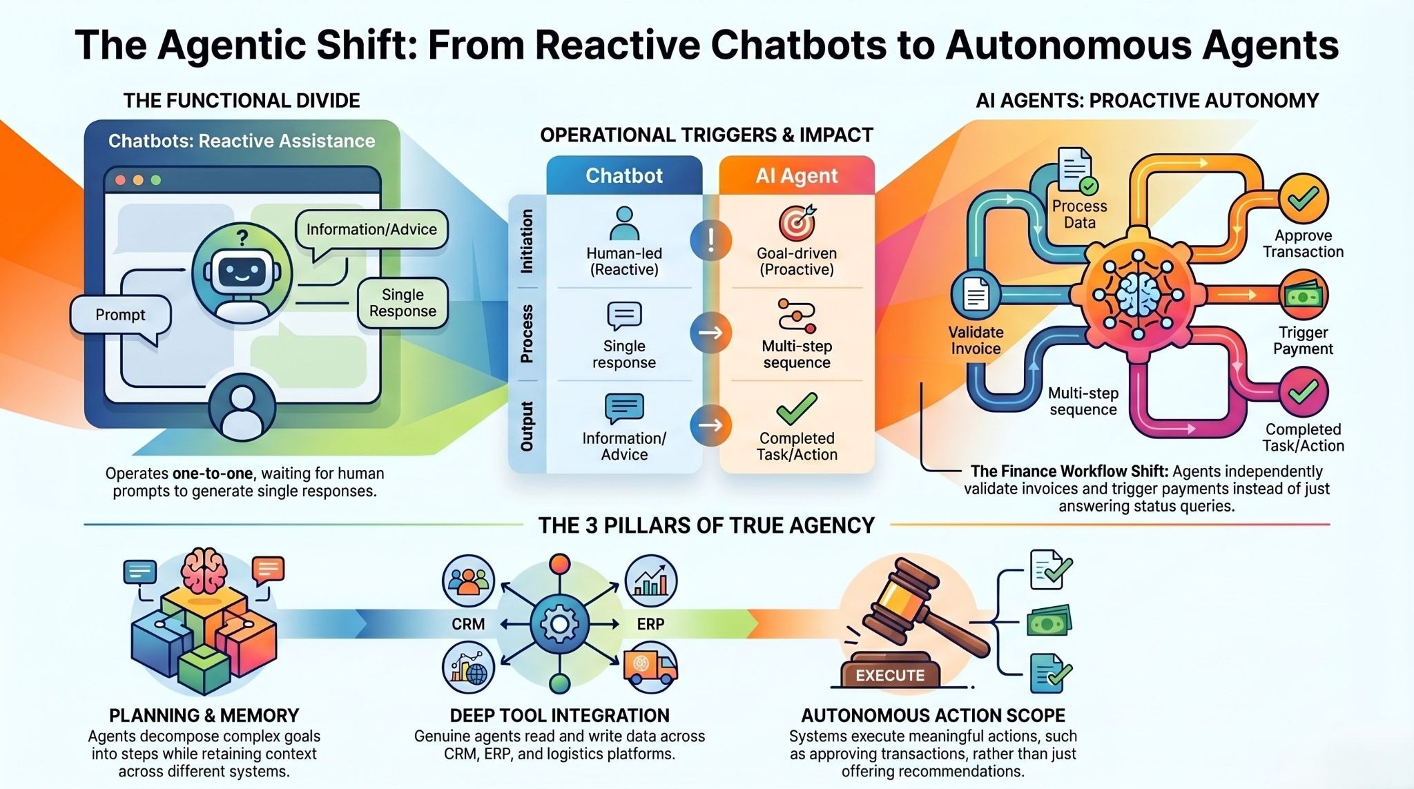 Here is a concrete illustration. A chatbot version of a finance assistant answers questions about invoice status when someone asks. An AI agent for finance monitors every invoice that enters the system, validates it against purchase orders, flags discrepancies, routes exceptions to the right approver, triggers payment runs for clean invoices, and logs every action with a full audit trail — without any human initiating the process.