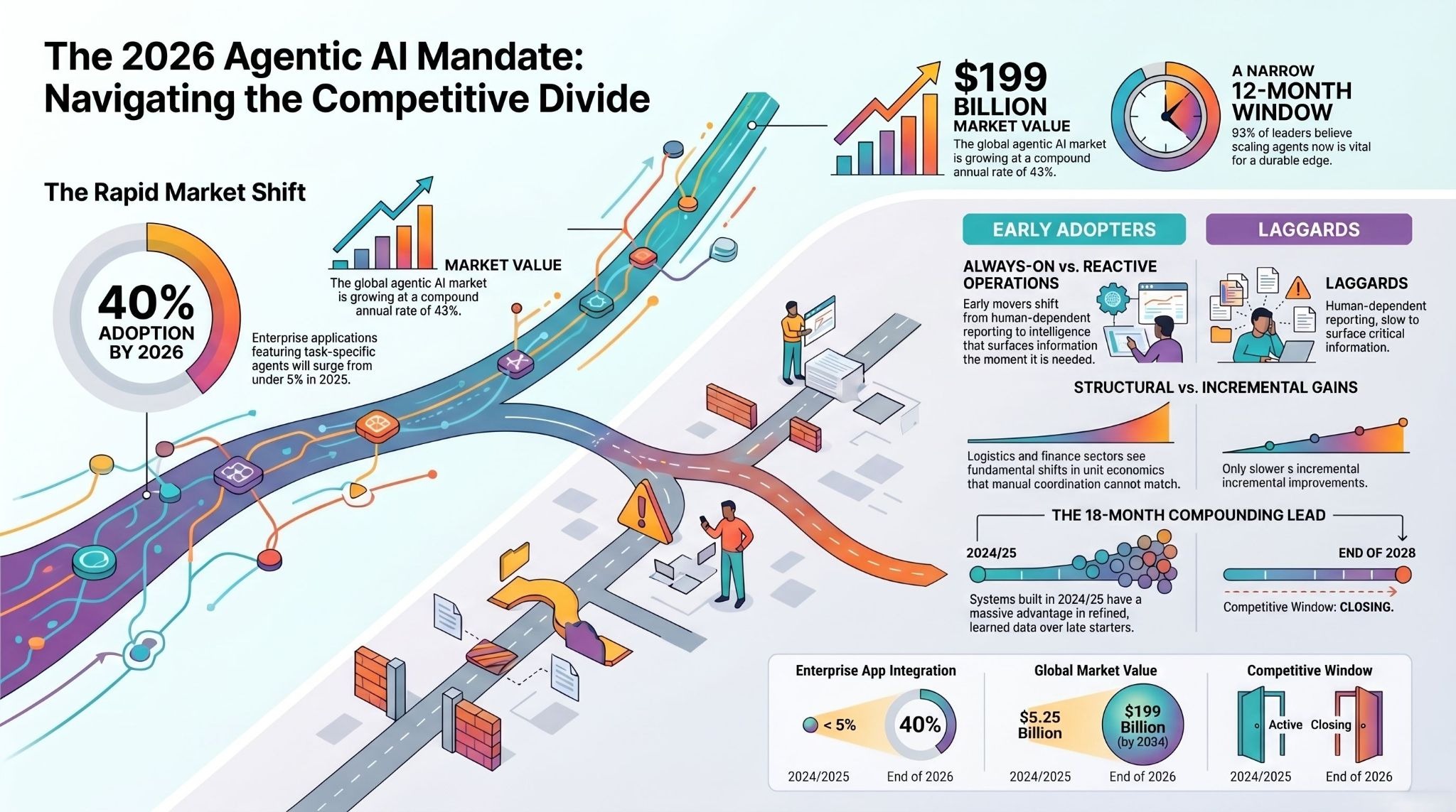 And the adoption curve is steeper than most leaders realize. When 40% of enterprise applications embed agents by the end of this year, the companies without agent infrastructure will not just be behind — they will be operating at a structural disadvantage in speed, cost, and decision quality against competitors who are running continuously while they are not.
