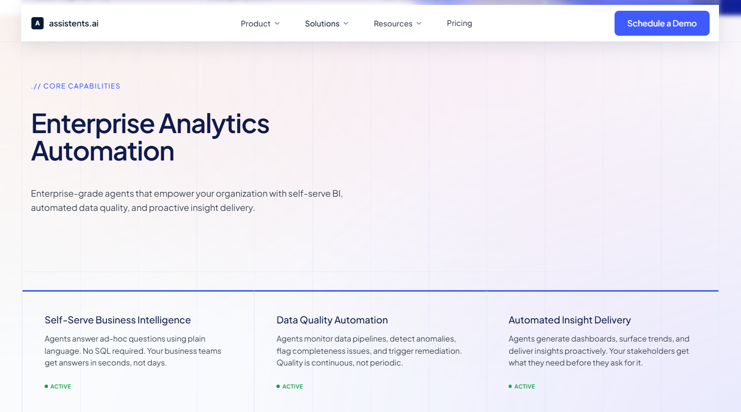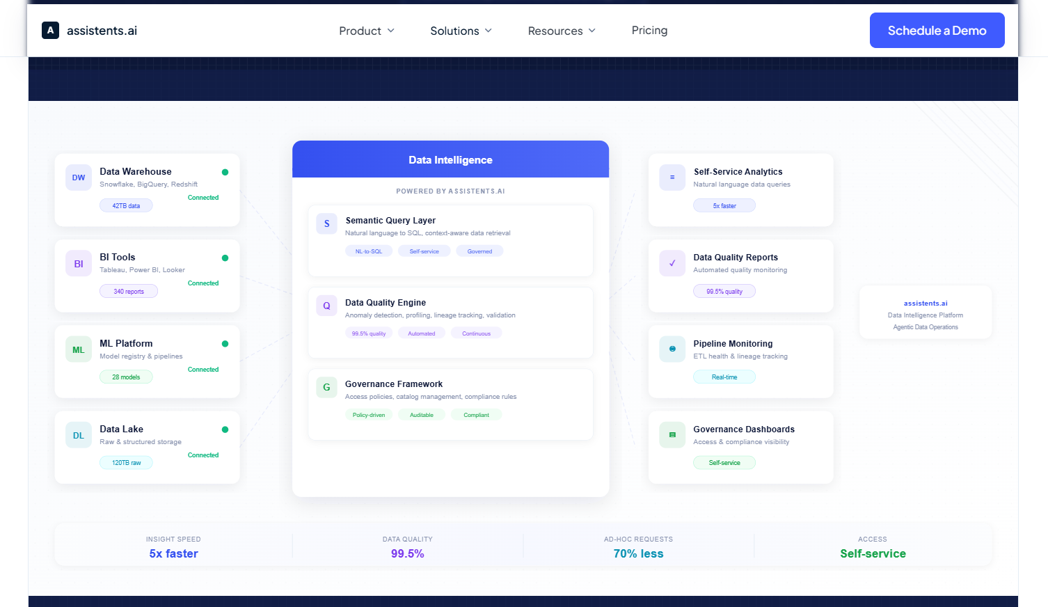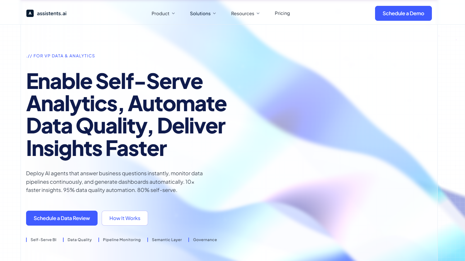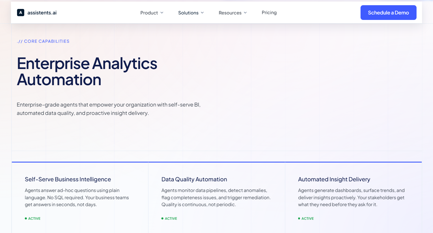 Explore how the VP Data and Analytics solution at assistents.ai delivers continuous data quality automation, self-serve BI, and governed pipeline monitoring in a single enterprise-grade platform.