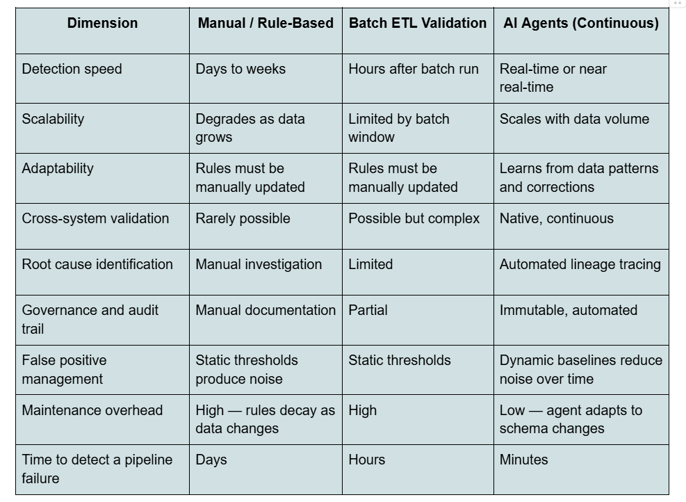 The distinction from traditional tools is not just about speed. It is about architecture. Rule-based data quality tools execute predefined checks on a defined schedule. If a new data pattern emerges that the rules do not cover, it goes undetected. If a pipeline schema changes, validation breaks until someone updates it manually. The tools are as good as the rules written into them, and maintaining those rules at enterprise scale becomes a full-time job.