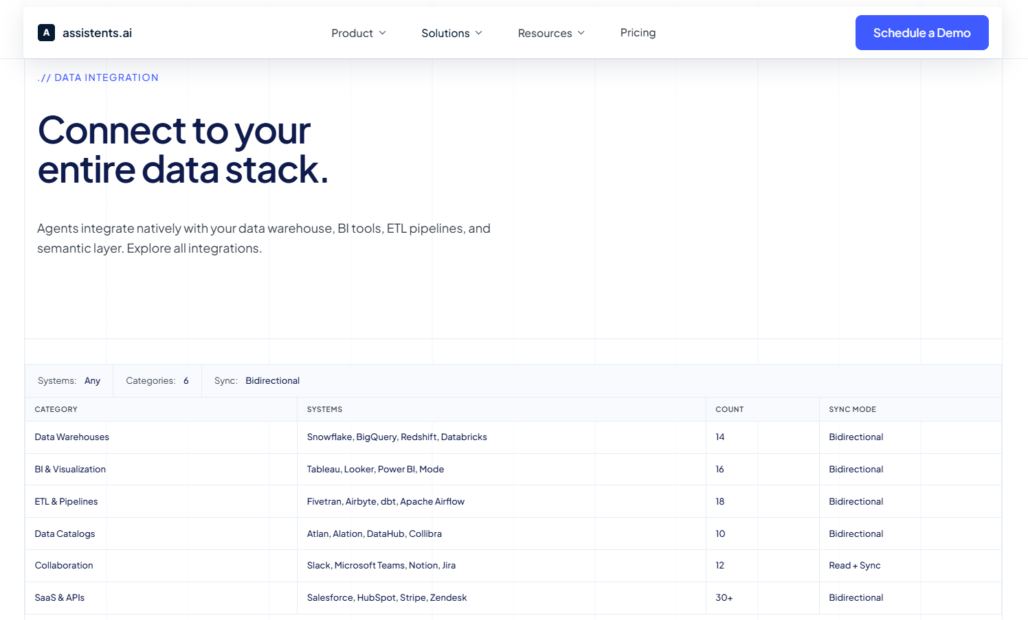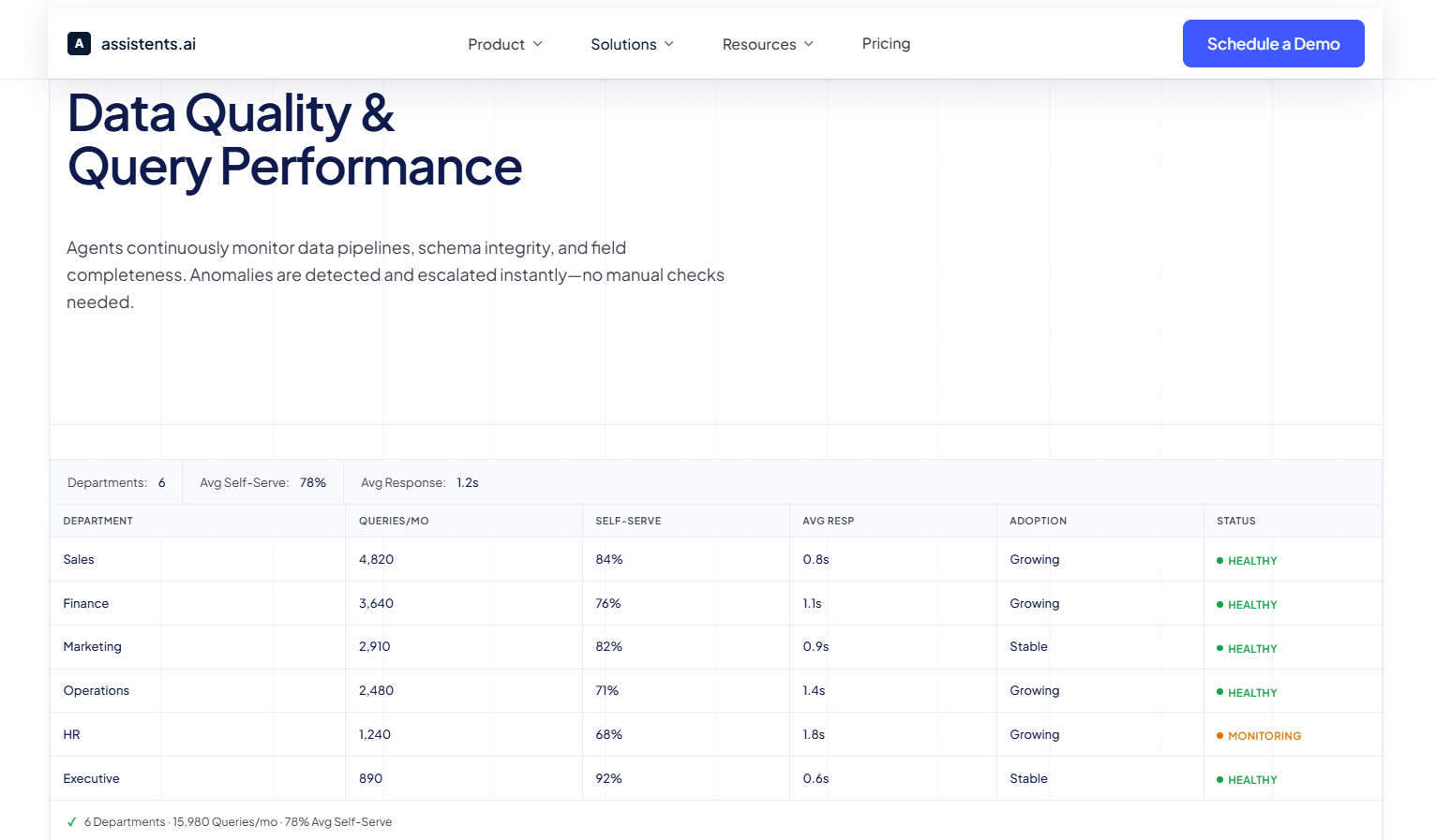 The enterprise analytics platform built for VP Data and Analytics leaders at assistents.ai integrates continuous data quality monitoring directly into the analytics pipeline. Agents monitor data sources — Snowflake, Salesforce, PostgreSQL, HubSpot, Stripe, and more — tracking freshness, quality scores, row volumes, and pipeline latency in real time. When a source falls below the quality threshold required for reliable analysis, the agent flags it before it reaches a dashboard or a business query.