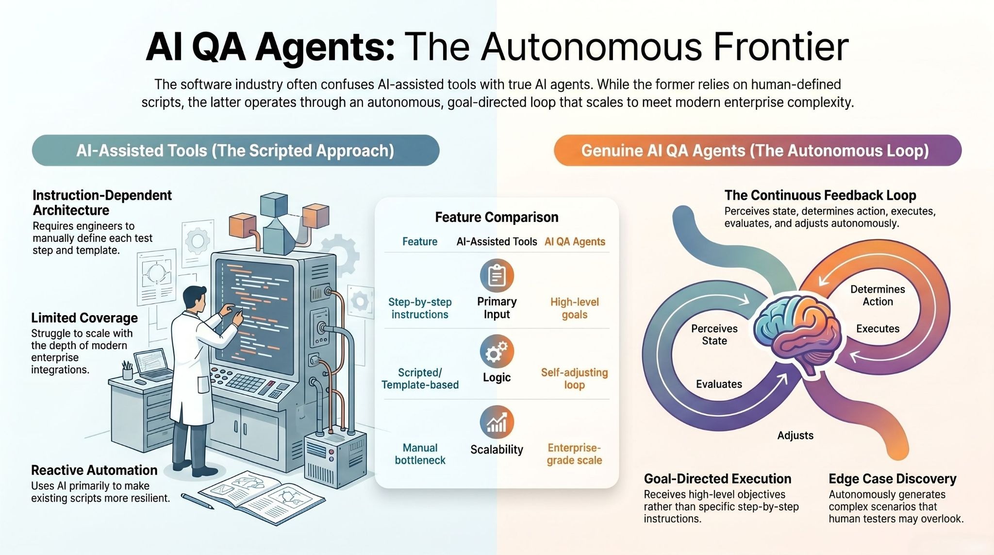 The term "AI agent" is applied loosely across the software testing industry. Chatbots that suggest test cases are called agents. Copilots that generate a Playwright script when prompted are called agents. Understanding what a genuine AI agent does — versus an AI-assisted tool — is the foundation for evaluating any platform.