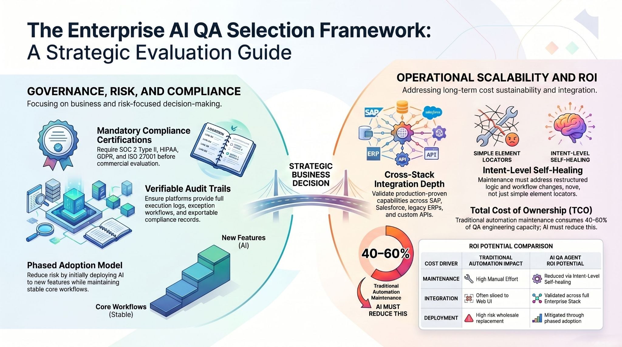 Enterprise AI QA agent evaluation is frequently misframed as a technical decision. It is a business and risk decision, and should be evaluated accordingly. The following checklist reflects the criteria that matter most for enterprise deployment success.
