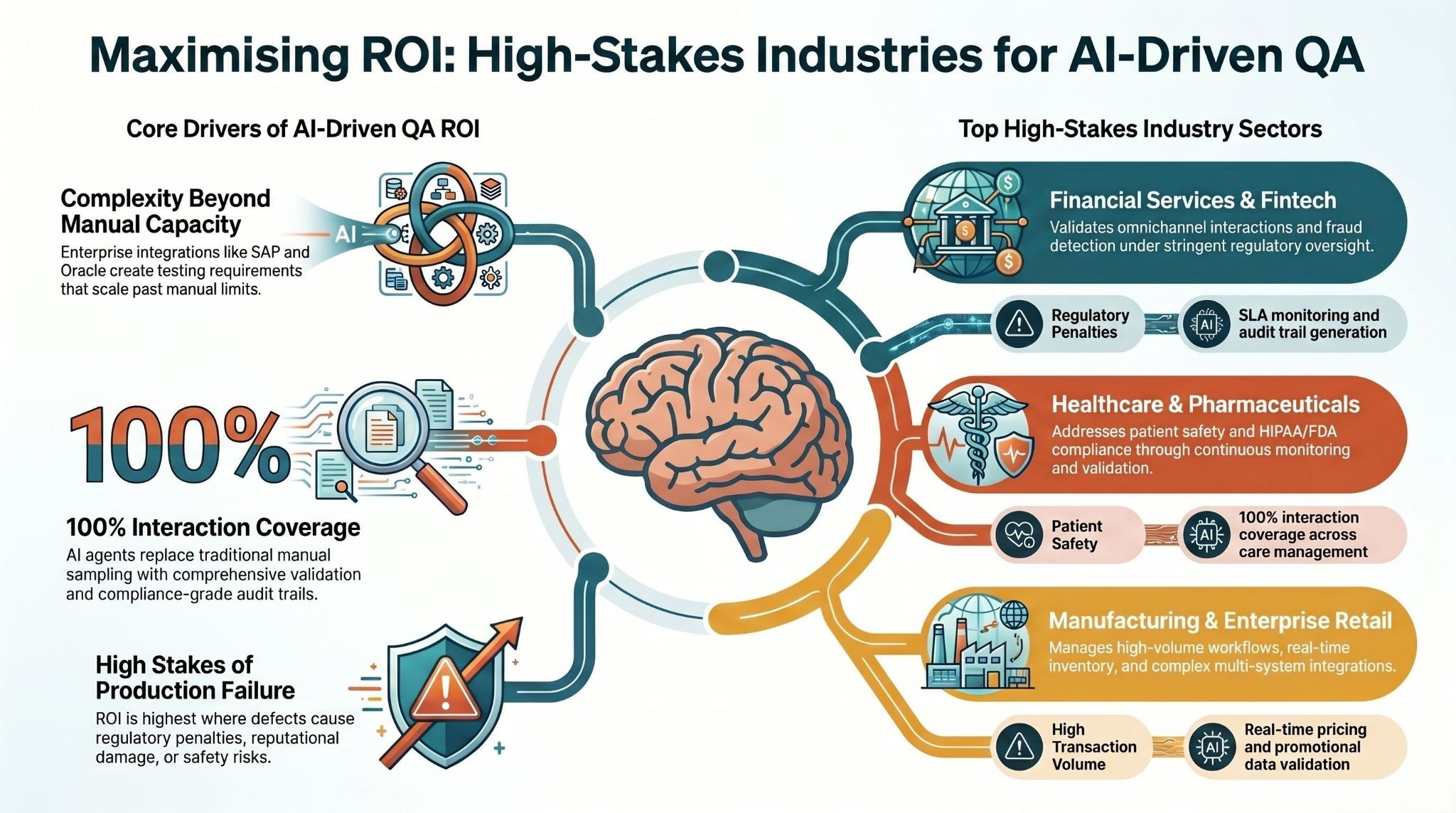 Not all industries benefit equally from AI agents in QA testing. The highest ROI concentrates in environments where application complexity is high, compliance requirements are strict, integration depth is significant, and the cost of a defect reaching production is severe.