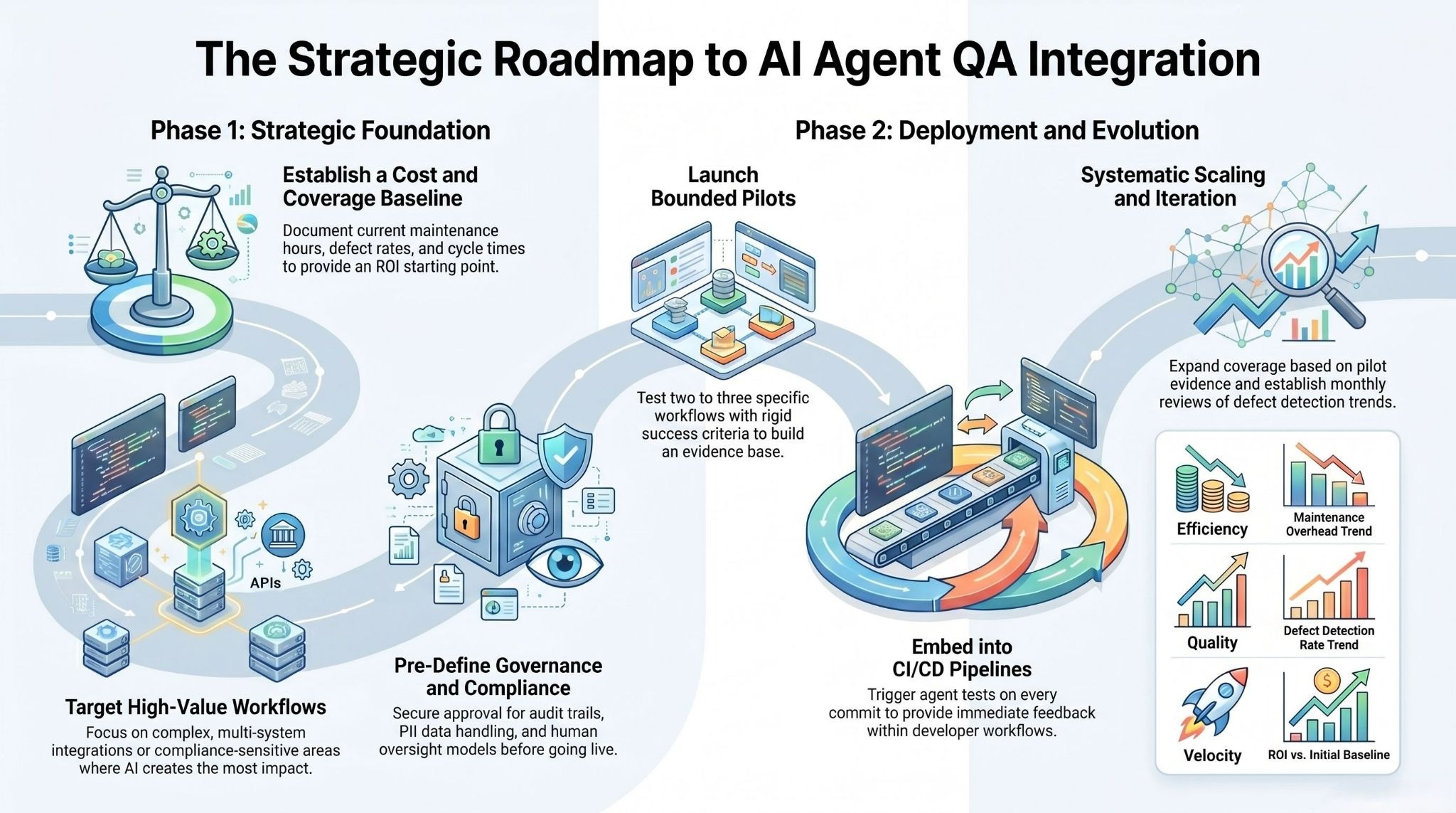 The highest leverage point for AI QA agents is inline CI/CD integration — tests triggering on every commit and pull request, with results visible to developers in the context of their current work. Establishing this integration pattern during the pilot phase creates the infrastructure for coverage expansion without architectural rework.