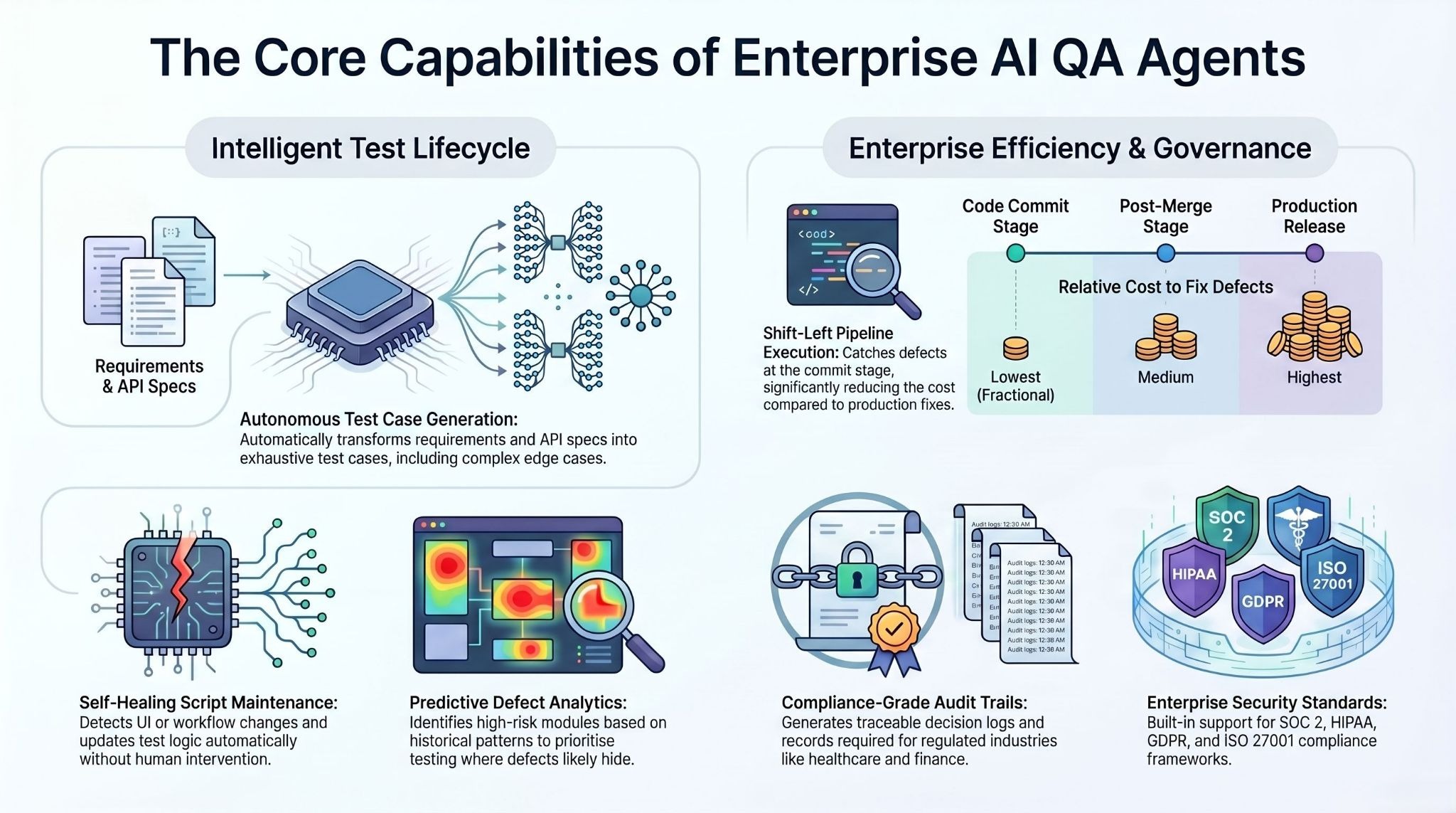 Enterprise AI QA agents are designed to operate inside the delivery pipeline, not alongside it. Tests trigger on every code commit, pull request, and deployment, providing feedback to developers in the context where it is most actionable — before code merges, not after a release cycle ends.