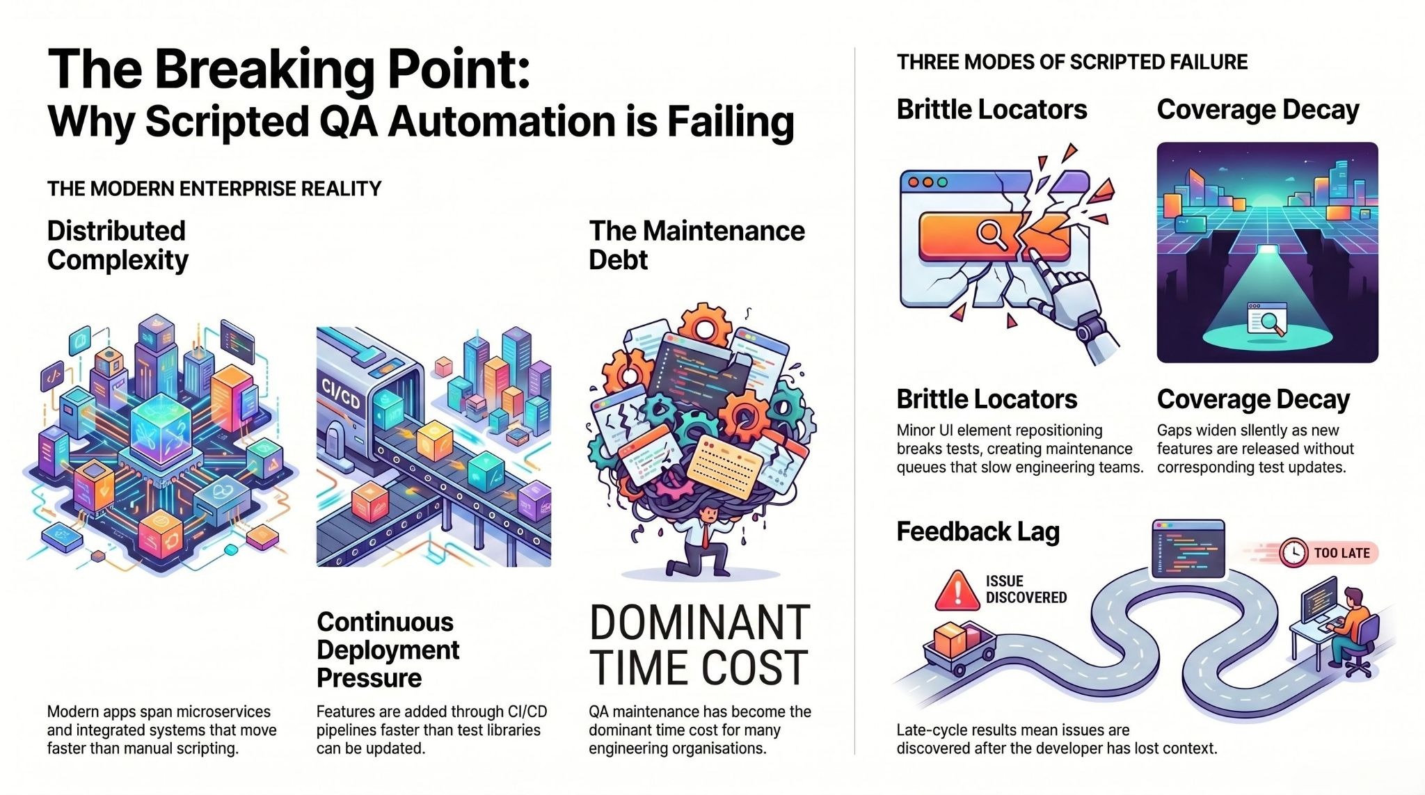 Scripted automation has three compounding failure modes in this environment. First, brittle locators — any UI change, even a minor element repositioning, breaks tests and creates a maintenance queue that slows down engineering teams. Second, coverage decay — as features are added faster than test libraries are updated, coverage gaps widen silently until a defect escapes to production. Third, the feedback lag — traditional automation produces results at the end of a cycle, not inline with each code commit, which means issues are discovered long after the relevant context has left the developer's mind.