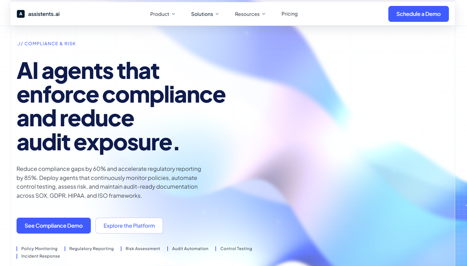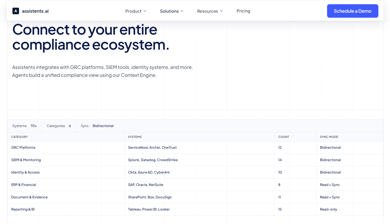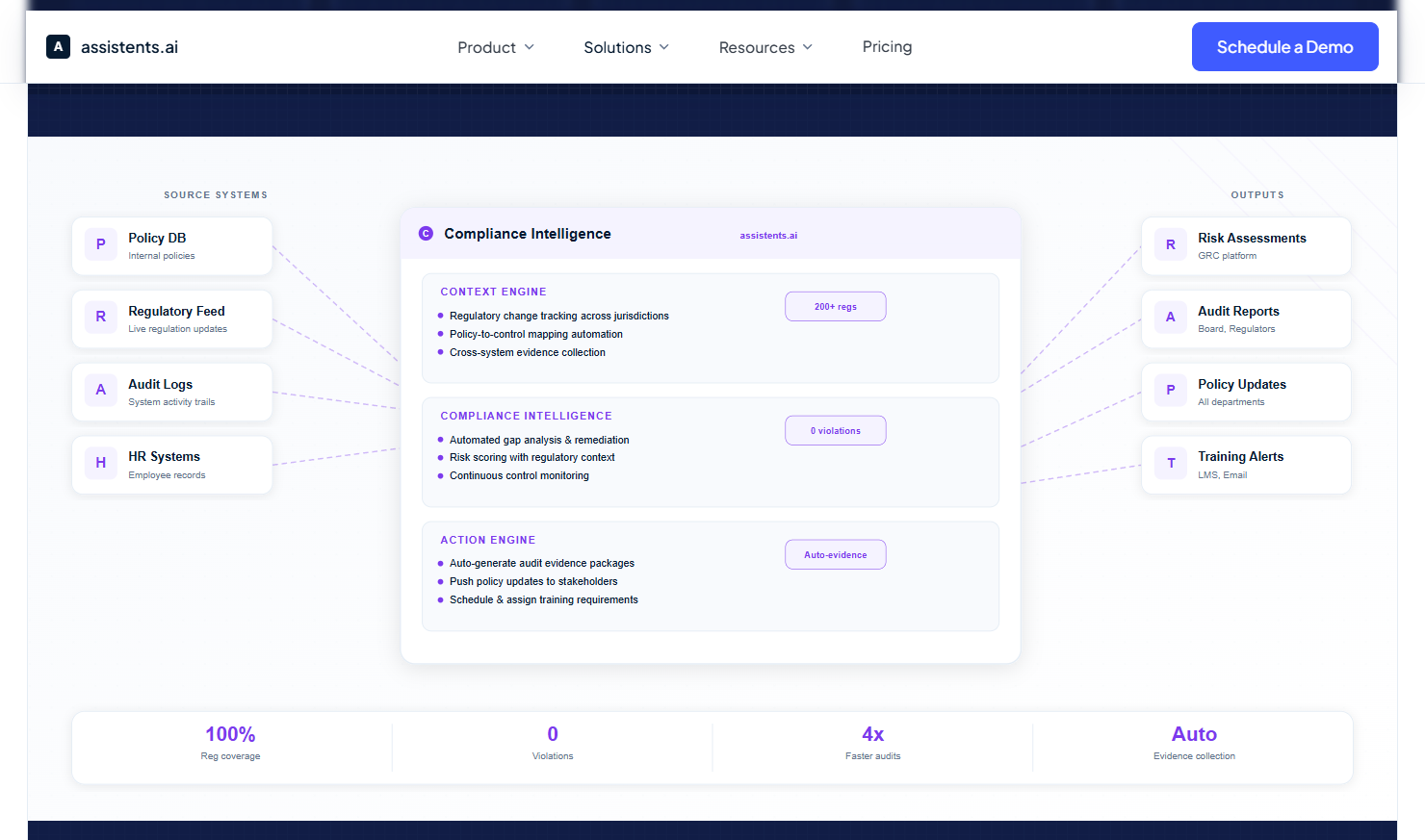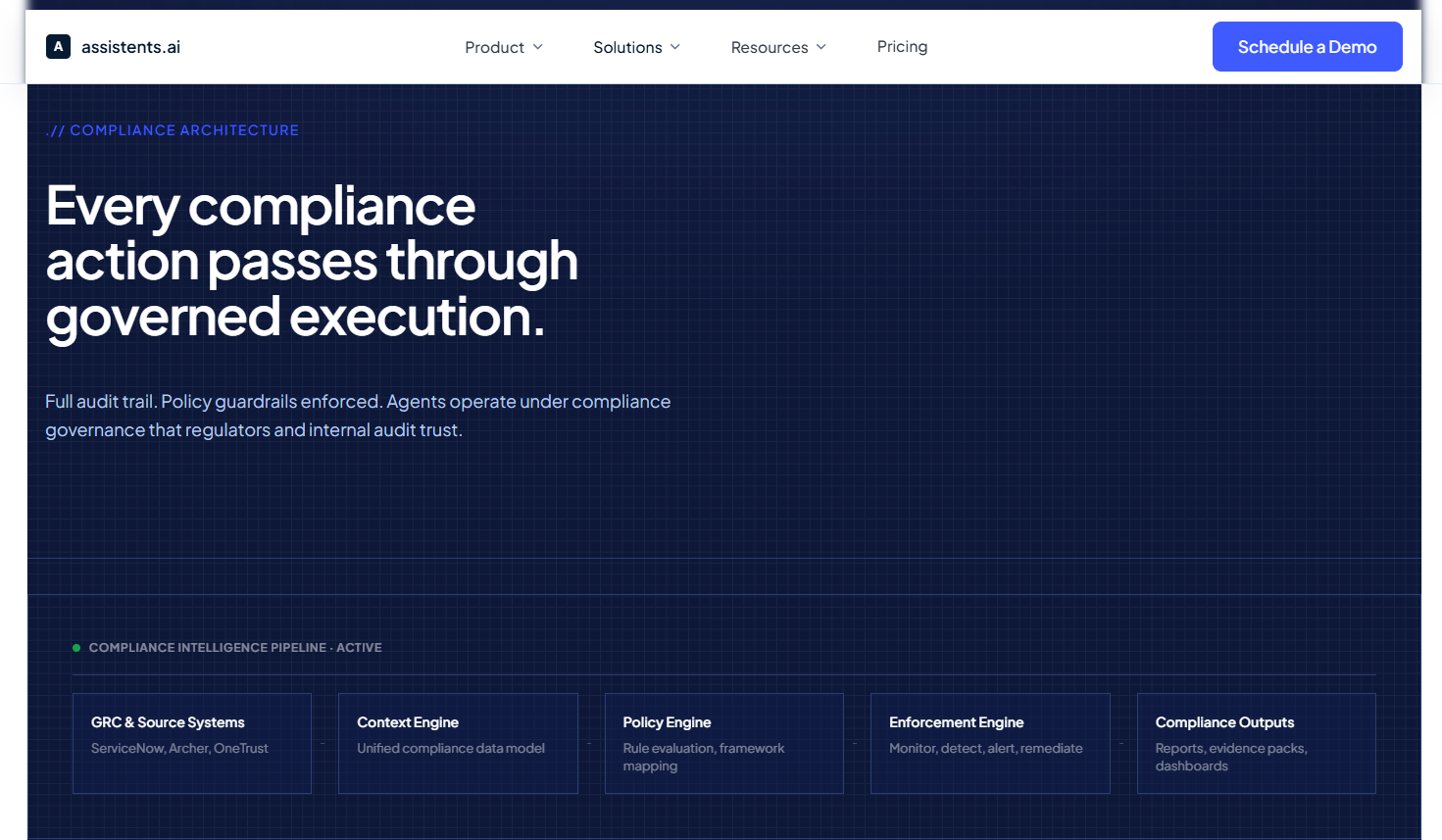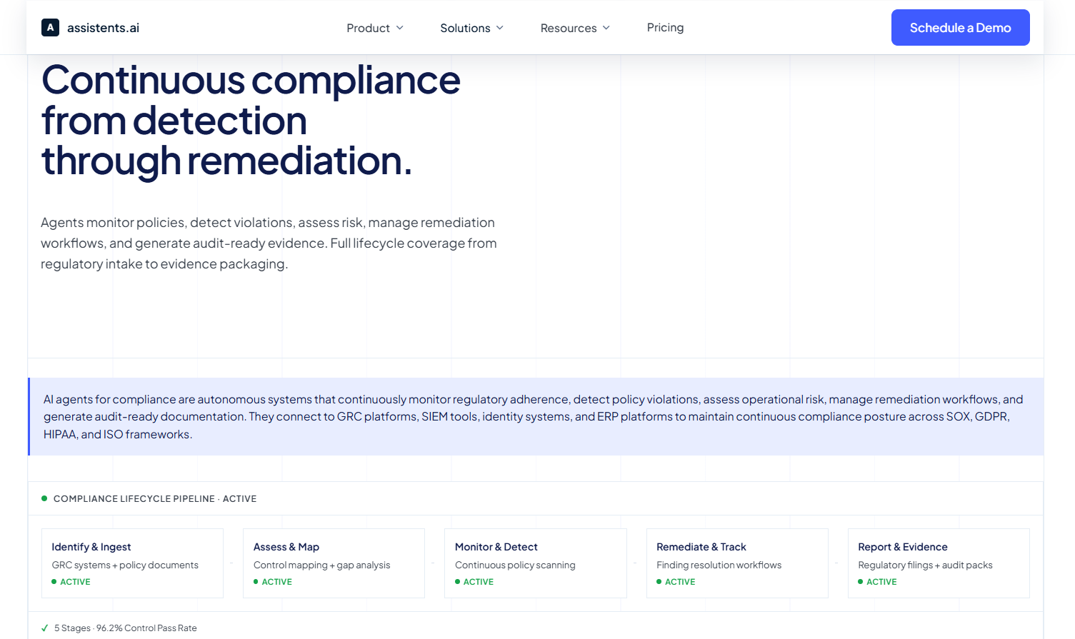 assistents.ai's compliance solution is built around a five-stage continuous compliance lifecycle: identify and ingest, assess and map, monitor and detect, remediate and track, and report and evidence. The platform connects to over 70 pre-built integrations across GRC platforms, SIEM tools, identity systems, ERP platforms, and document repositories — and maintains a unified compliance data model through its Context Engine.