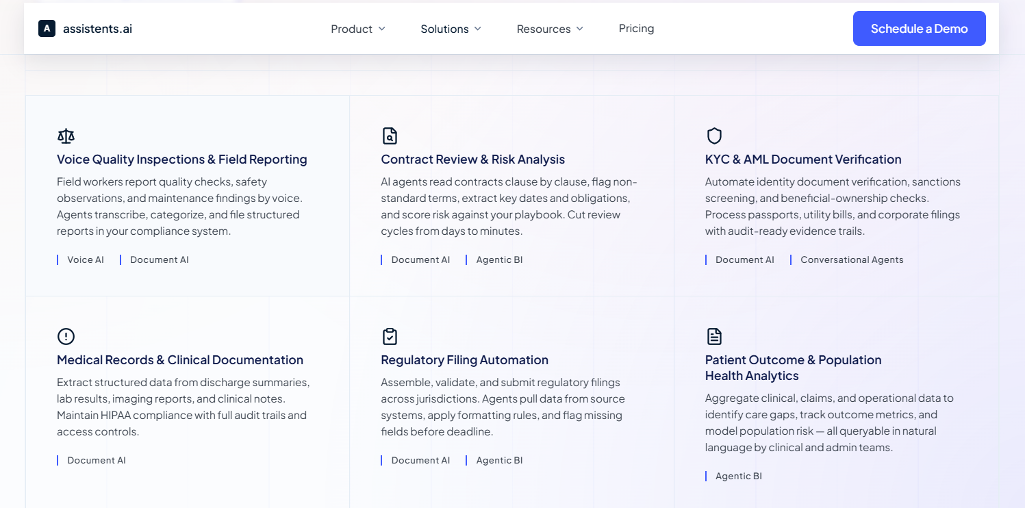 The platform supports specific use cases including KYC and AML document verification, contract review and risk analysis, regulatory filing automation, medical records and clinical documentation (HIPAA-compliant), and voice quality inspections and field reporting.