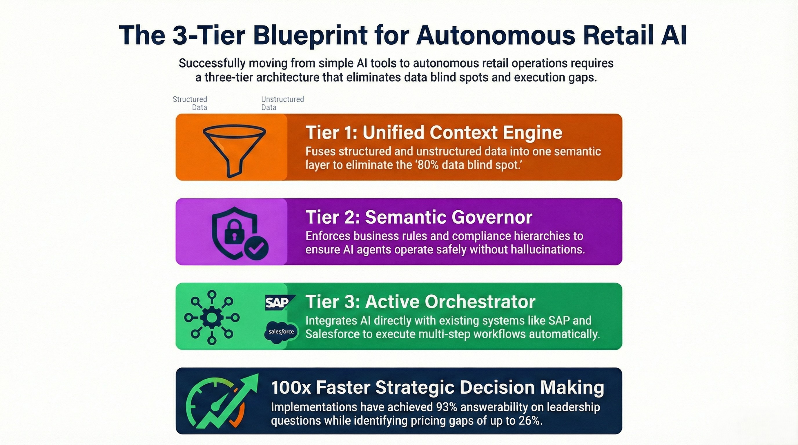Successfully implementing AI for retail operations requires more than deploying individual tools. It demands a comprehensive infrastructure that addresses three fundamental challenges: the data blind spot, the governance gap, and the execution problem. Advanced AI platforms solve these through a three-tier architecture designed specifically for autonomous, governed enterprise operations.
