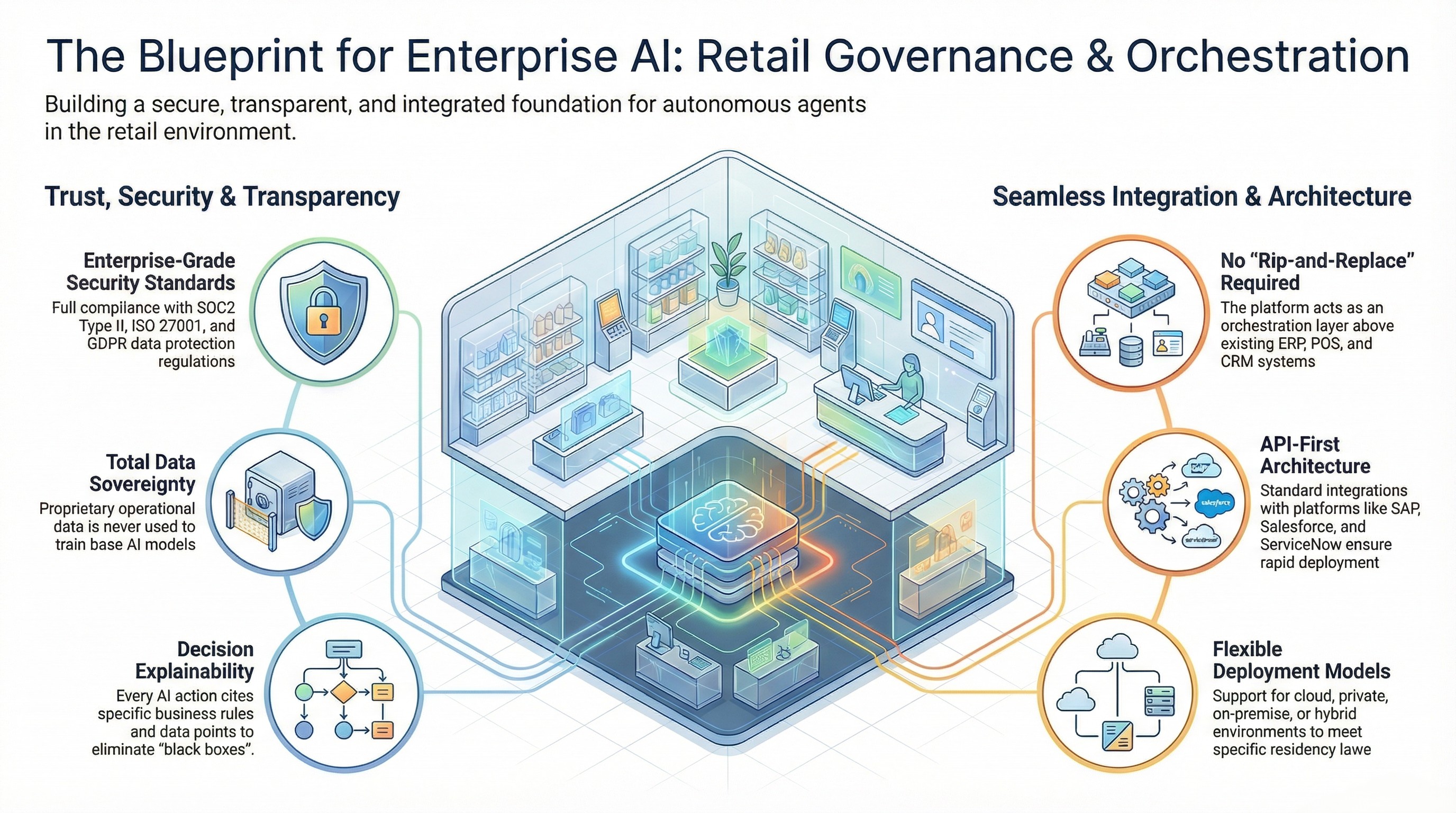 Enterprise AI for retail operations must meet stringent requirements that consumer AI tools simply don't address. When autonomous agents are making decisions that impact revenue, customer experience, and regulatory compliance, governance isn't optional—it's foundational.