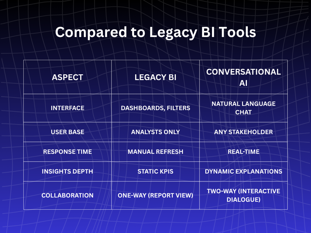AI gives answers in real time, validated against live data. According to a 2025 Deloitte survey, 71% of CFOs using conversational analytics report faster executive decision cycles and 28% fewer manual reporting errors.