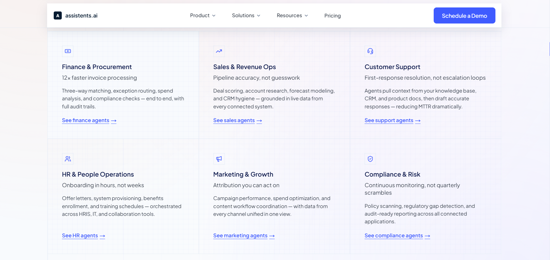 A defining characteristic of assistents.ai is that it does not deploy generic AI into enterprise departments and ask those departments to figure out what to do with it. Every department gets agents with domain-specific knowledge, pre-configured system connectors, and governance rules calibrated to the risk profile of the decisions those departments make.