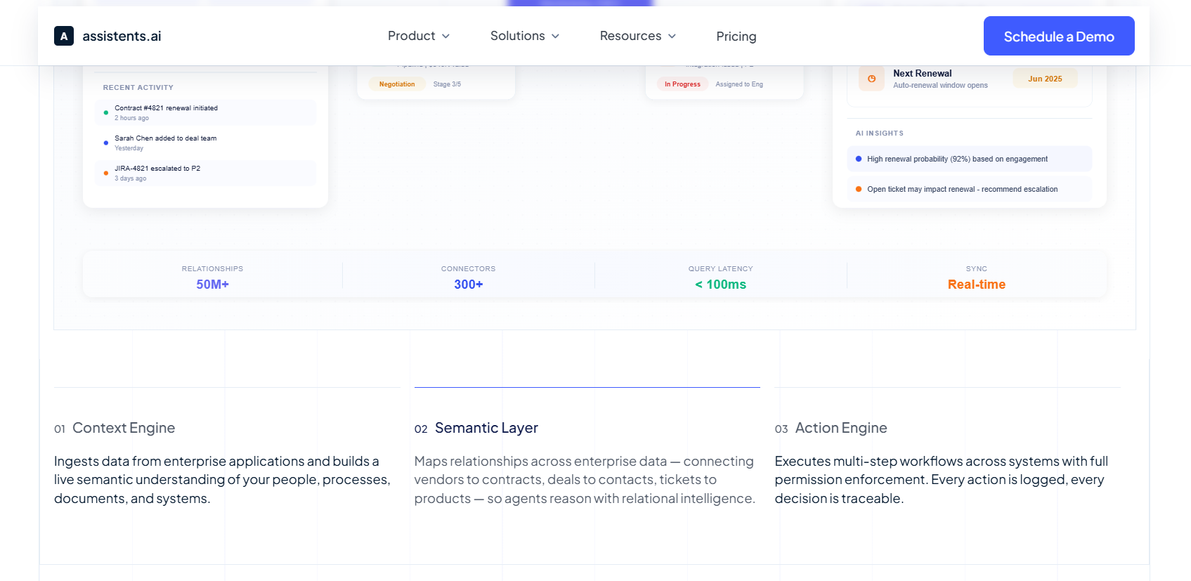 The Semantic Layer maps relational intelligence across enterprise data. It connects vendors to contracts, deals to contacts, tickets to products, employees to policies, transactions to compliance requirements. When an agent needs to understand what "net working capital" means for this specific business, or how a particular exception to a procurement rule should be handled, or which regulatory jurisdiction applies to a cross-border transaction, it draws on the Semantic Layer. This is what gives assistents.ai agents contextual intelligence rather than statistical pattern-matching. Without this layer, agents produce inconsistent responses that erode trust over time.