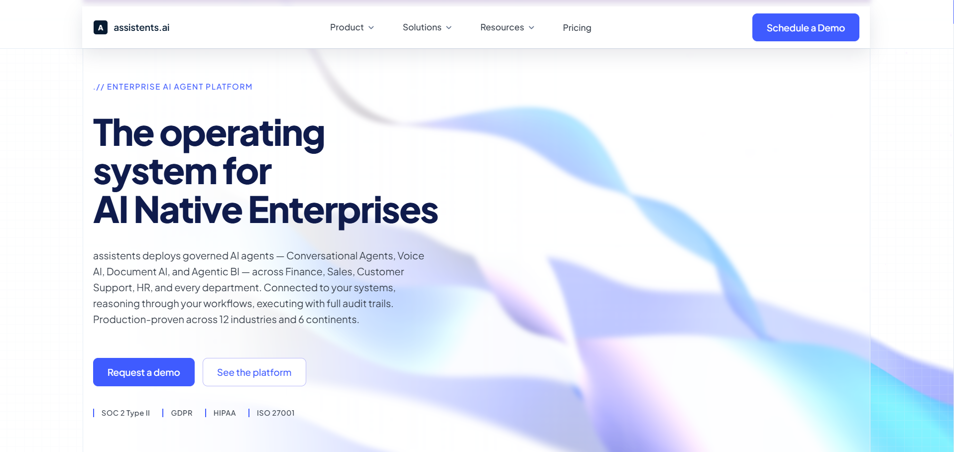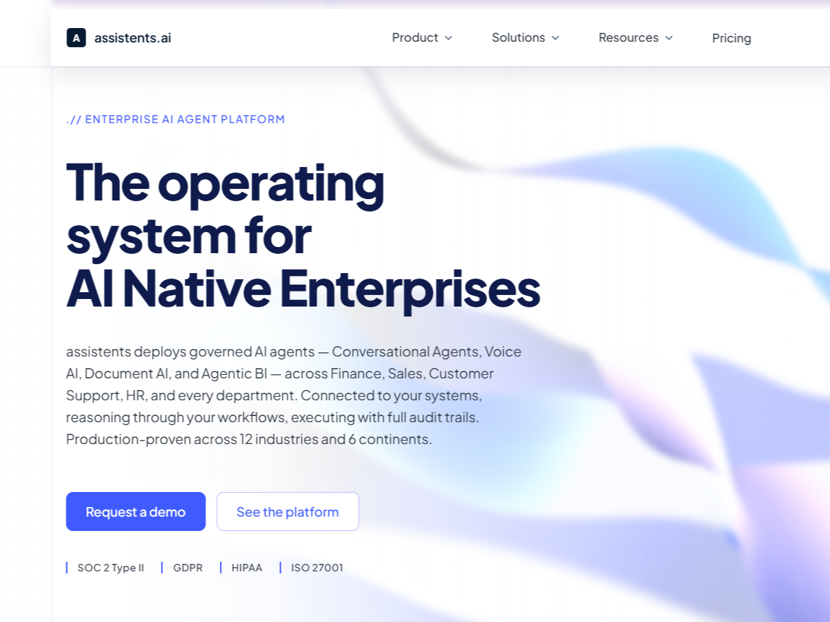 assistents.ai is the operating system for AI-native enterprises. It deploys governed AI agents — Conversational Agents, Voice AI, Document AI, and Agentic Business Intelligence — across every department that runs your business, connected to your existing systems, reasoning through your real workflows, and executing with full audit trails.