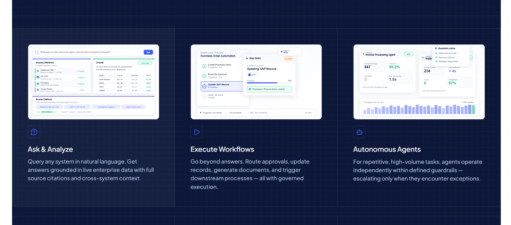 The entry point for most enterprise deployments. Teams query any connected system in natural language and receive answers grounded in live enterprise data, complete with source citations and cross-system context. This mode replaces the pattern of extracting data into spreadsheets, analysing it manually, and presenting stale findings at weekly review meetings.
