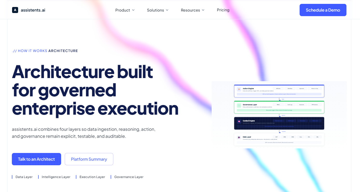 The more significant governance difference is architectural. assistents.ai's Semantic Governor enforces consistent rules, role-based permissions, audit trails, and explainability across every agent action across the entire platform. This is particularly important for enterprises in regulated industries — financial services, healthcare, energy — where governance cannot be an afterthought and must be embedded in how agents operate, not bolted on afterward.