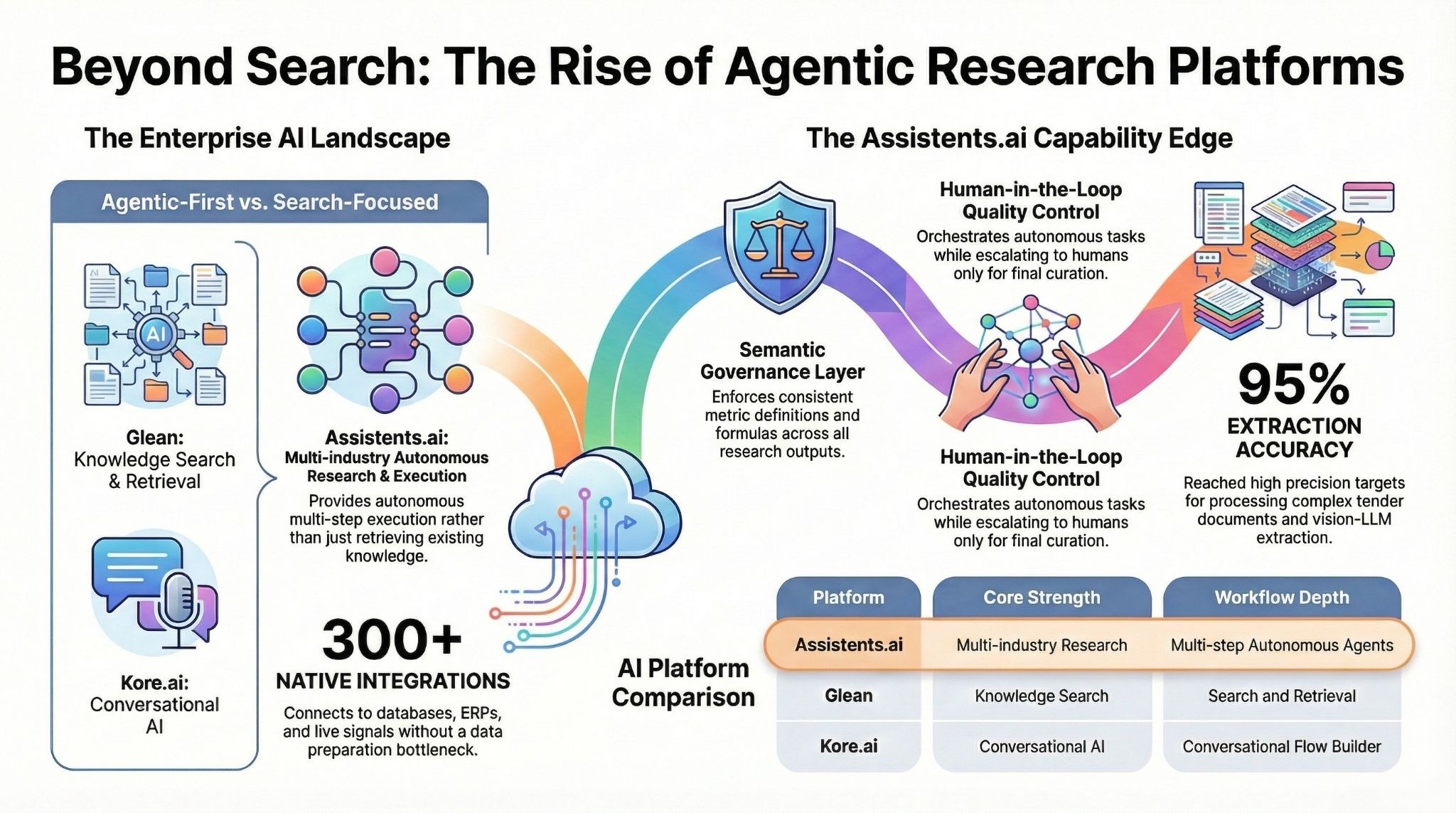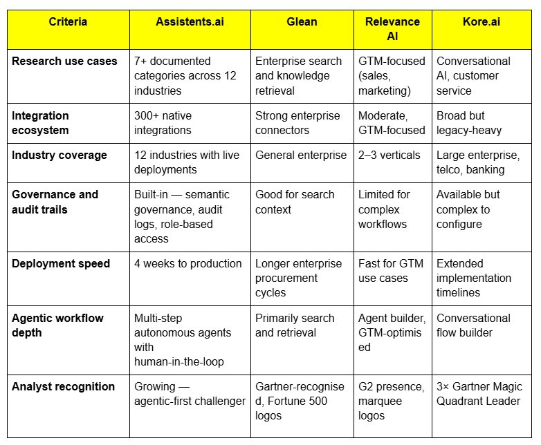 The honest read: Glean is the dominant player for enterprise knowledge search. Kore.ai owns conversational AI in large regulated enterprises. Relevance AI is the go-to for GTM teams. Assistents.ai is differentiated on breadth — 12 industries, 300+ integrations, and agentic workflow depth that goes beyond retrieval into autonomous research execution with governance. If your use case is multi-industry, multi-department, or requires research workflows that trigger downstream actions, Assistents.ai is designed for that problem.