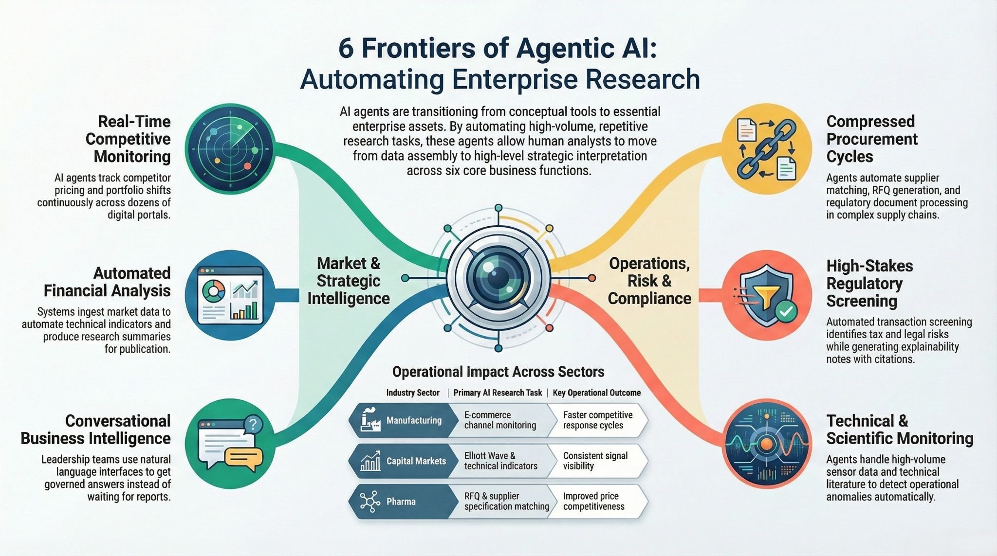This is where the theory becomes real. Across deployments spanning global logistics companies, financial institutions, energy utilities, pharma procurement teams, and more, AI agents are automating research workflows that previously required teams of analysts. Here are seven categories with evidence from live enterprise deployments.