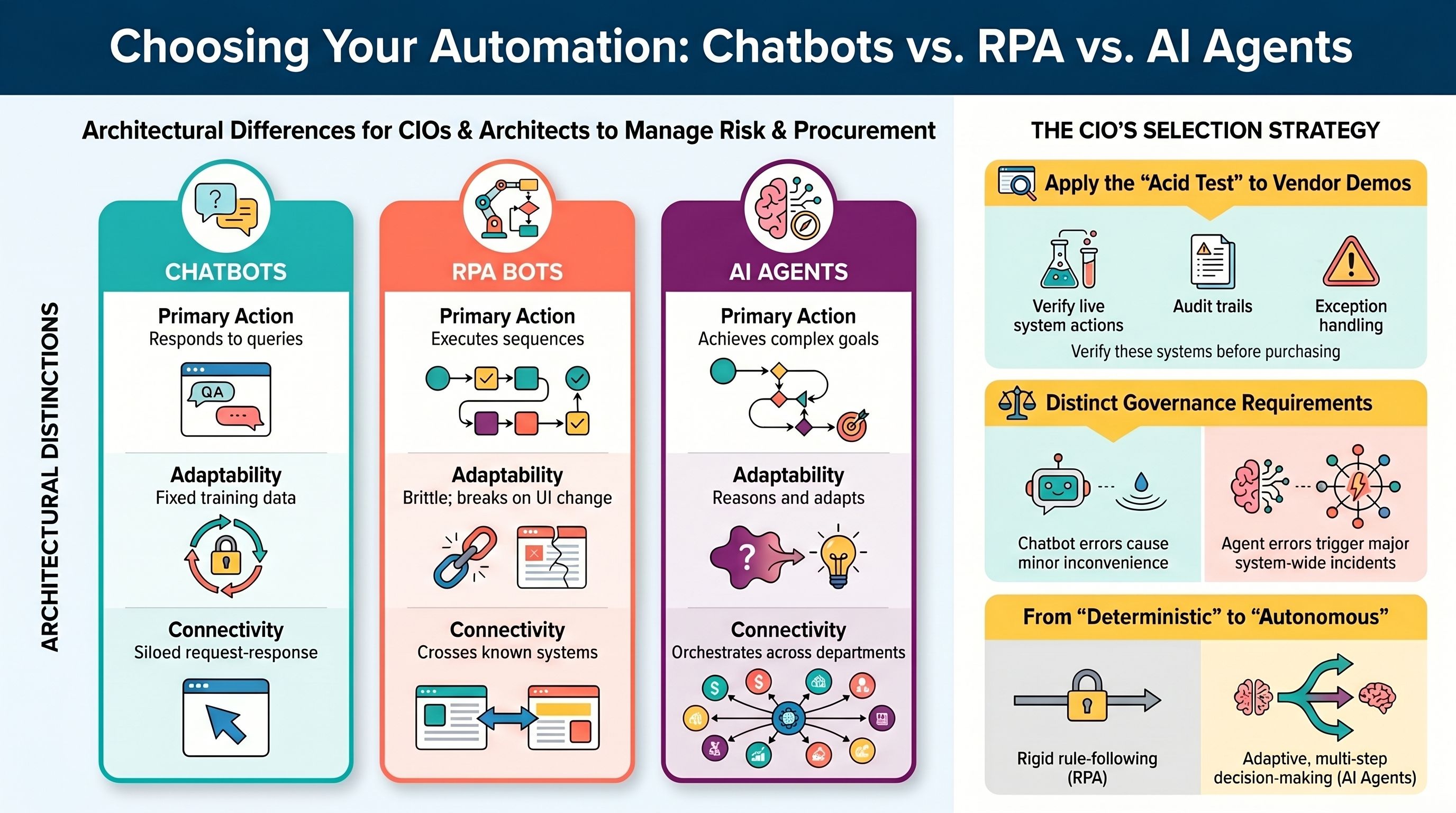 This distinction matters enormously for CIOs because the organizational impact — and the governance requirements — are fundamentally different. A chatbot failing to answer a question is a minor inconvenience. An agent taking the wrong action in your ERP, billing system, or compliance workflow is an incident.