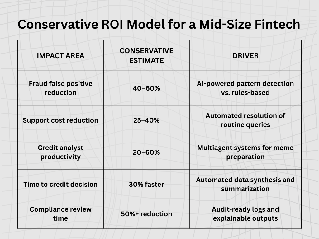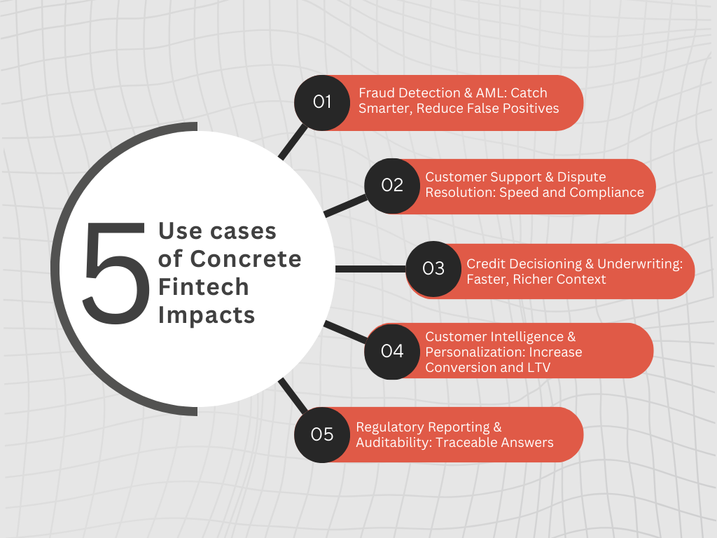 For fintech, the highest value comes from closing the loop between insight and action. The agentic layer can escalate cases, trigger alerts, freeze accounts, or push recommendations to downstream systems.