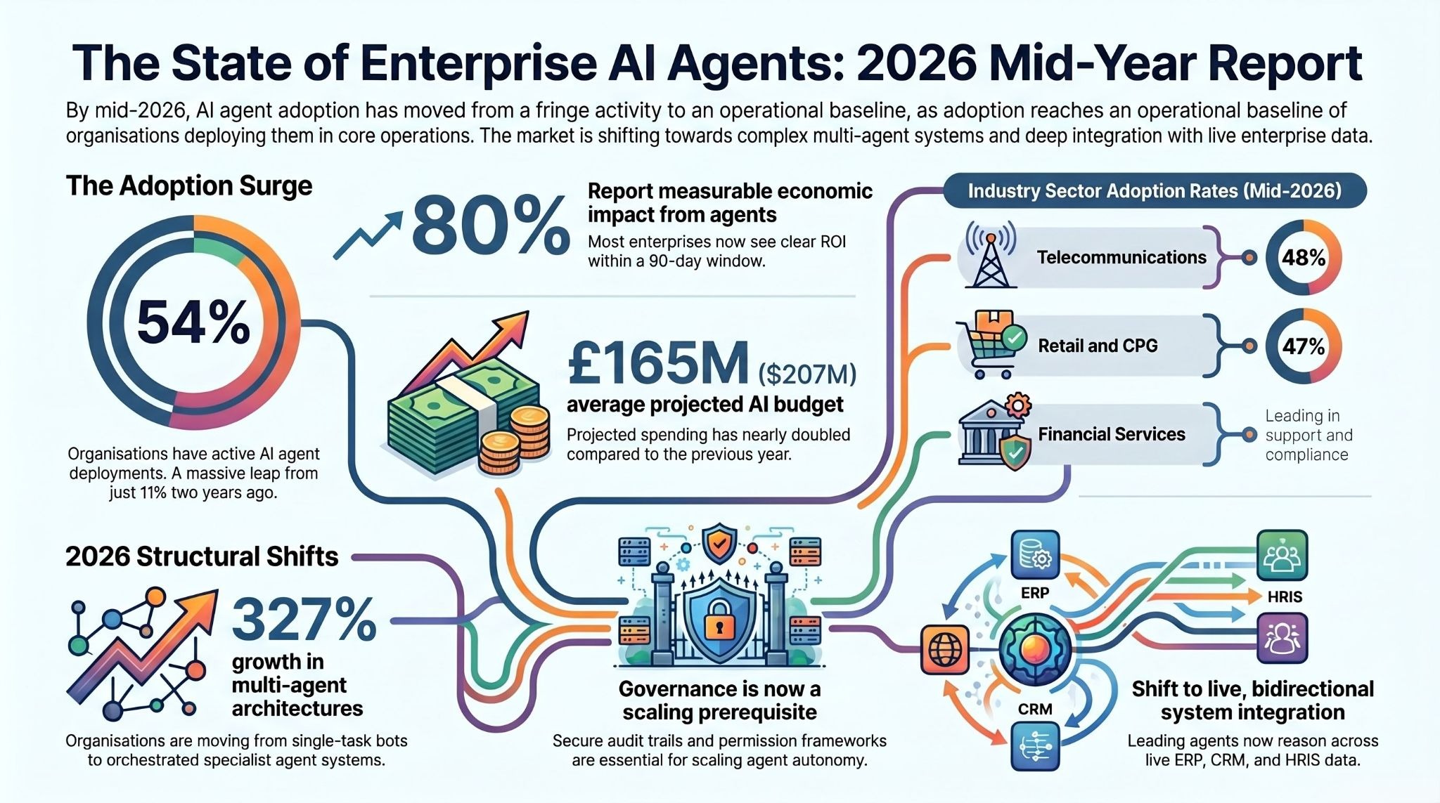 The conversation about enterprise AI agents has definitively moved from "should we deploy?" to "how do we scale?" The data from H1 2026 is unambiguous: more than half of enterprises are running agents in production, outcomes are measurable across every major industry vertical, and the organizations that built governance infrastructure first are scaling fastest.