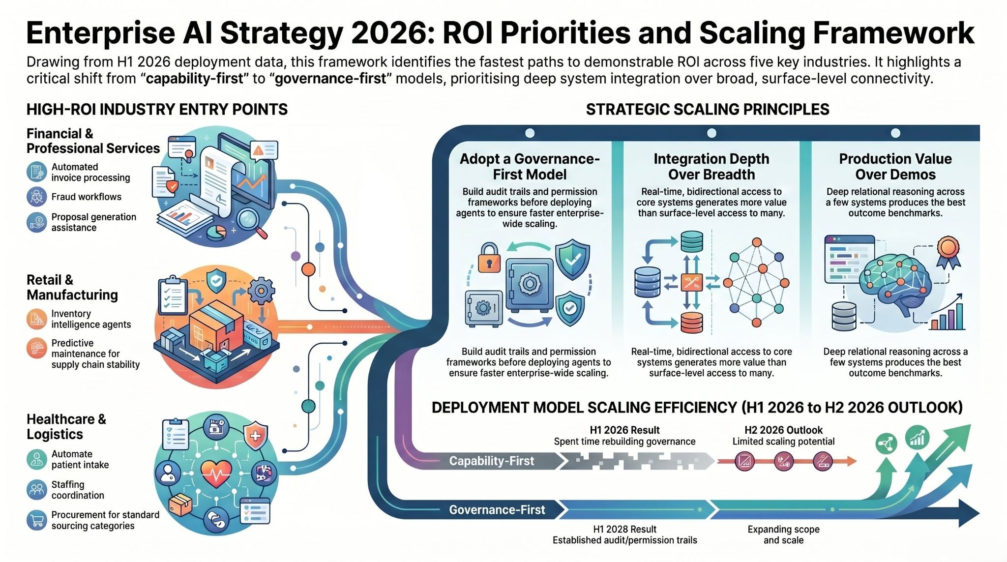 The clearest lesson from H1 2026 is that governance-first deployments scale faster than capability-first deployments. Organizations that launched with broad autonomy and minimal oversight are spending H1 2026 rebuilding the governance layer. Organizations that built audit trails, permission frameworks, and exception routing into their initial deployment are expanding scope in H2 2026.