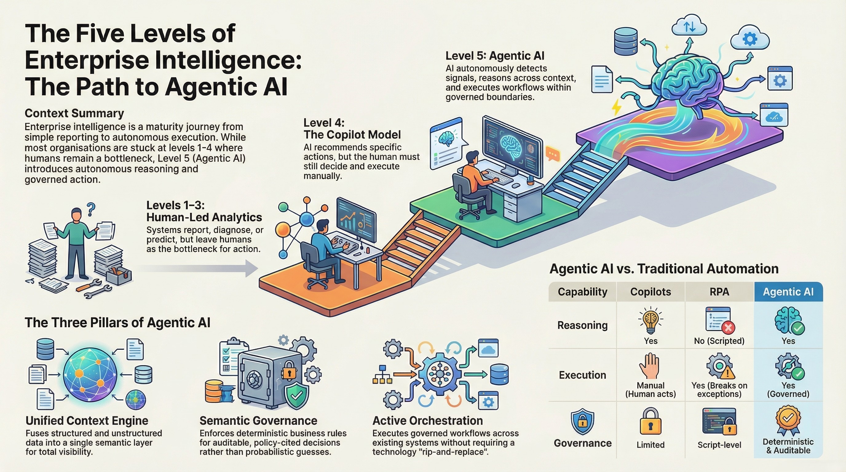 Agentic AI is Level 5 enterprise intelligence where AI agents autonomously detect signals, reason across the full data context (structured, unstructured, and external), execute multi-step workflows across enterprise systems, and produce auditable decision trails — all within deterministic governance boundaries that define which actions are autonomous and which require human approval.