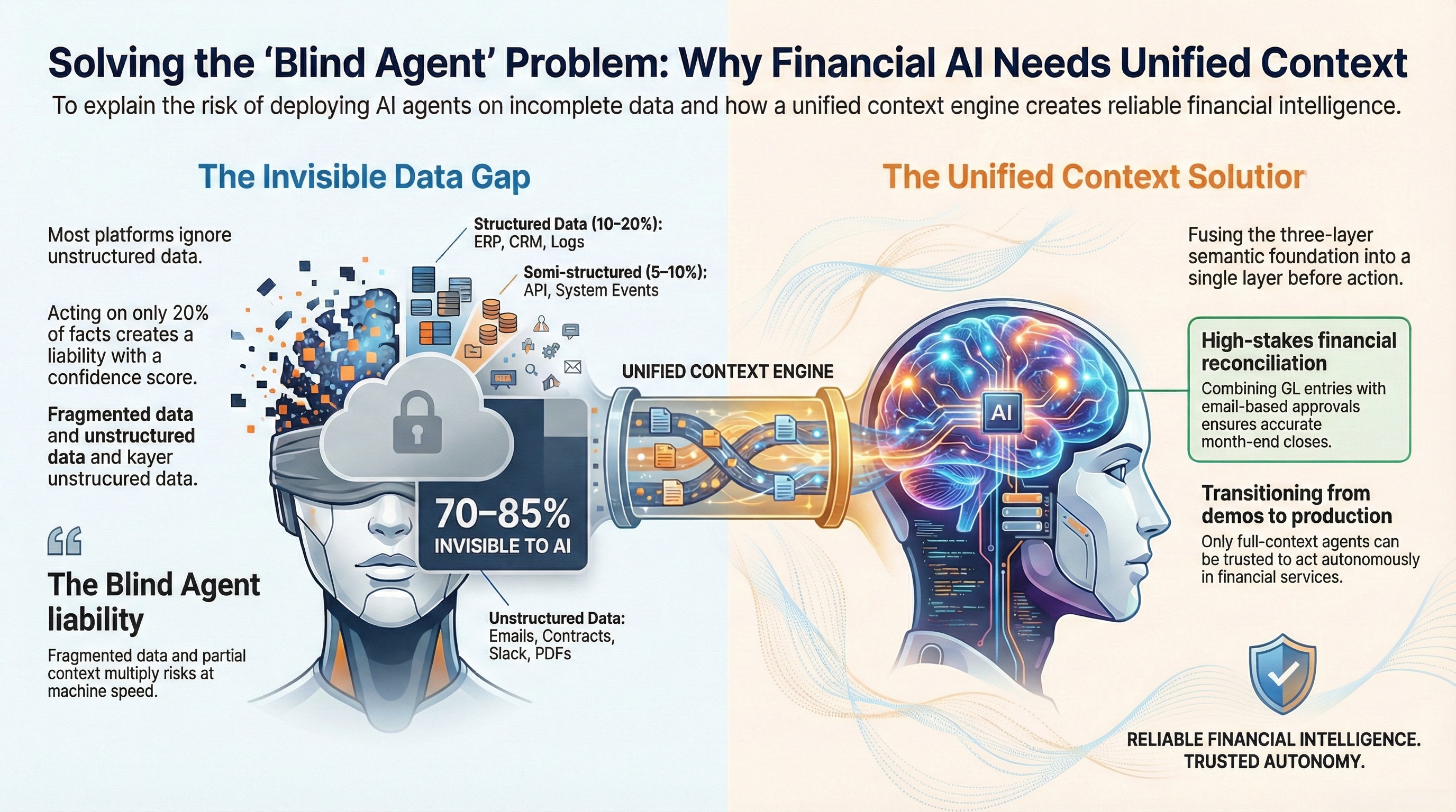 This is the Blind Agent Problem. Most agentic AI deployments in finance fail to perform in production because they are configured to access only structured data — ERP records, transaction logs, CRM fields — which represents 10–20% of the enterprise data landscape. The remaining 70–85% is unstructured: PDF contracts, email threads, policy documents, regulatory guidance, meeting notes, and correspondence that contains the real business context behind every financial decision. Effective agentic AI in finance needs all three layers: structured data for transaction facts, semi-structured data for system events and API signals, and unstructured data for the business context that makes those facts interpretable. Without all three, agents act on incomplete information — and incomplete information at machine speed is a financial risk, not an efficiency gain.