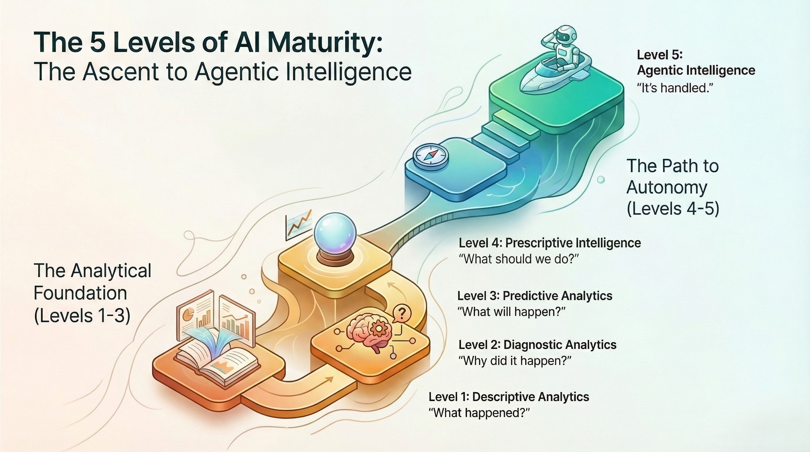 True agentic AI operates at Level 5. You state a goal, and the system identifies the issue, evaluates options across multiple data sources, executes multi-step workflows, routes approvals when needed, and learns and improves.